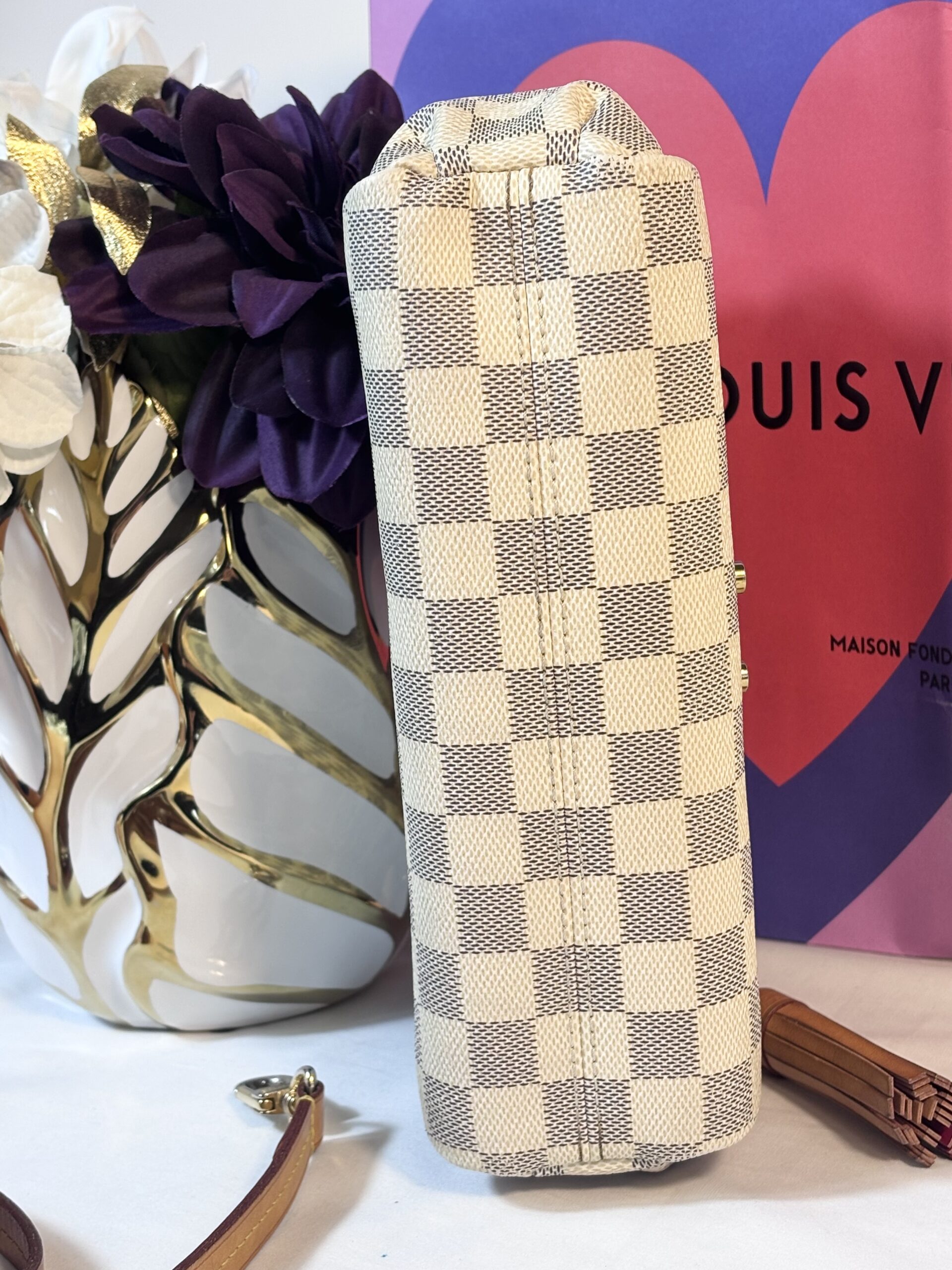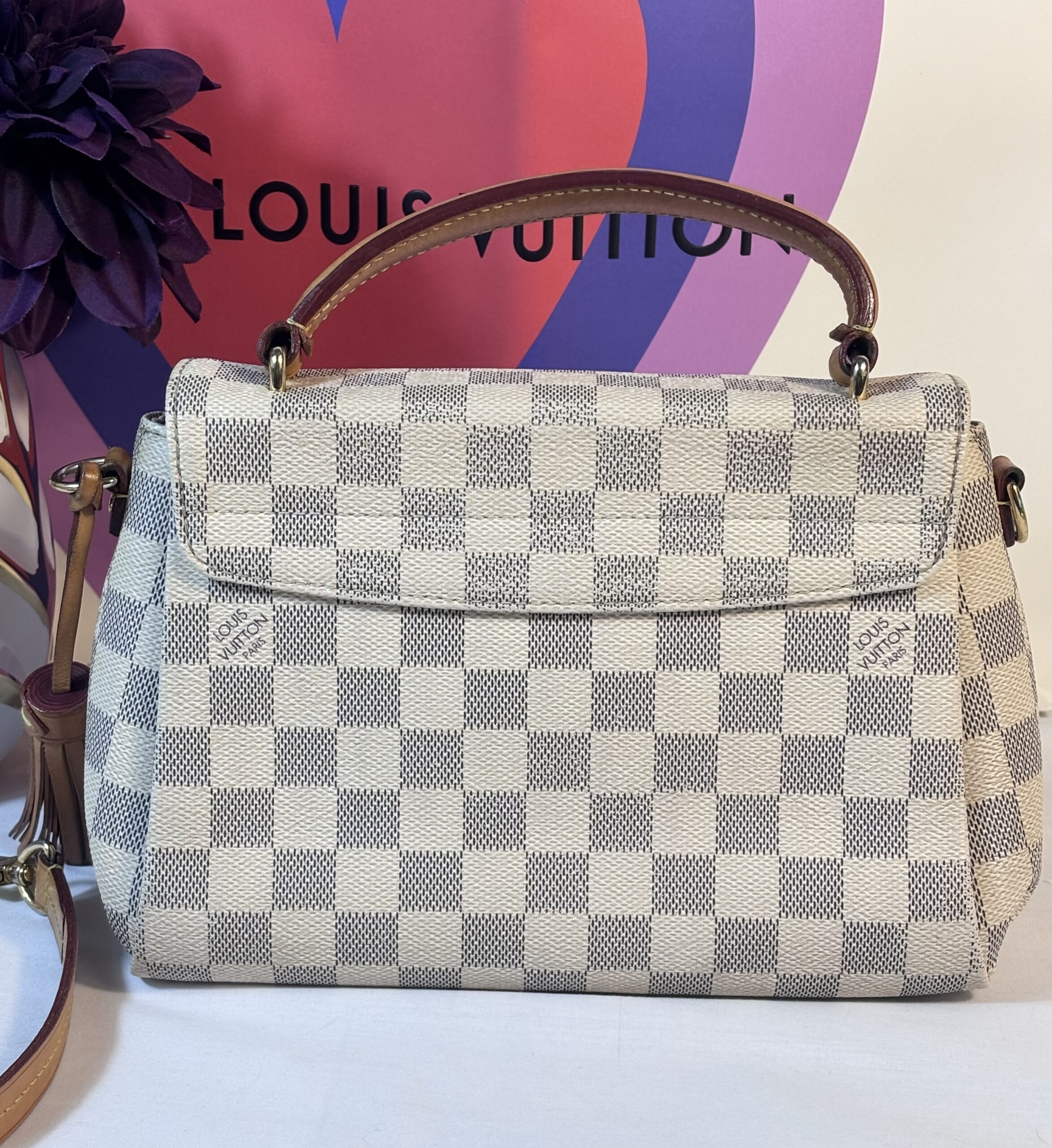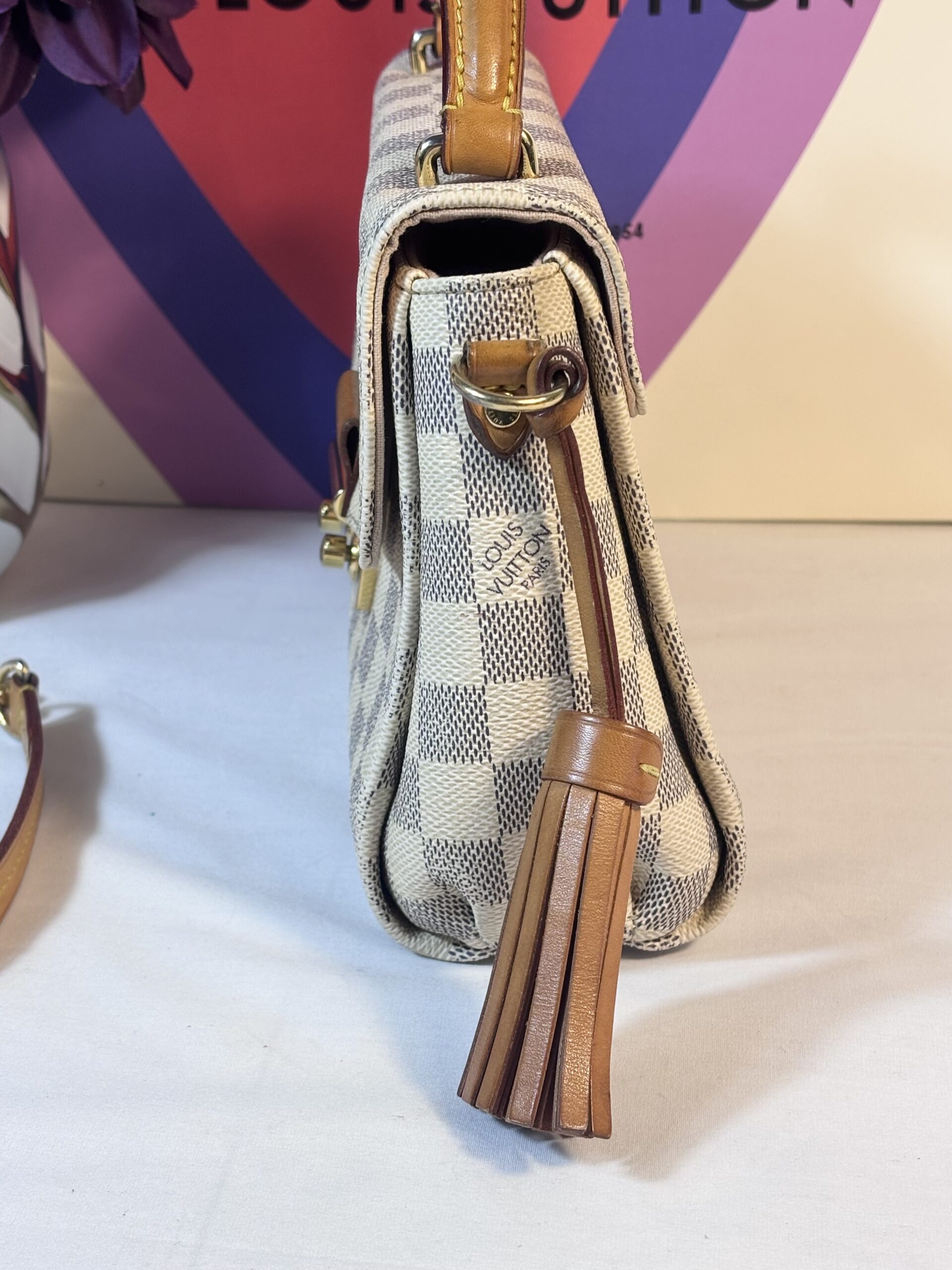 Includes dust bag, tassel, and strap