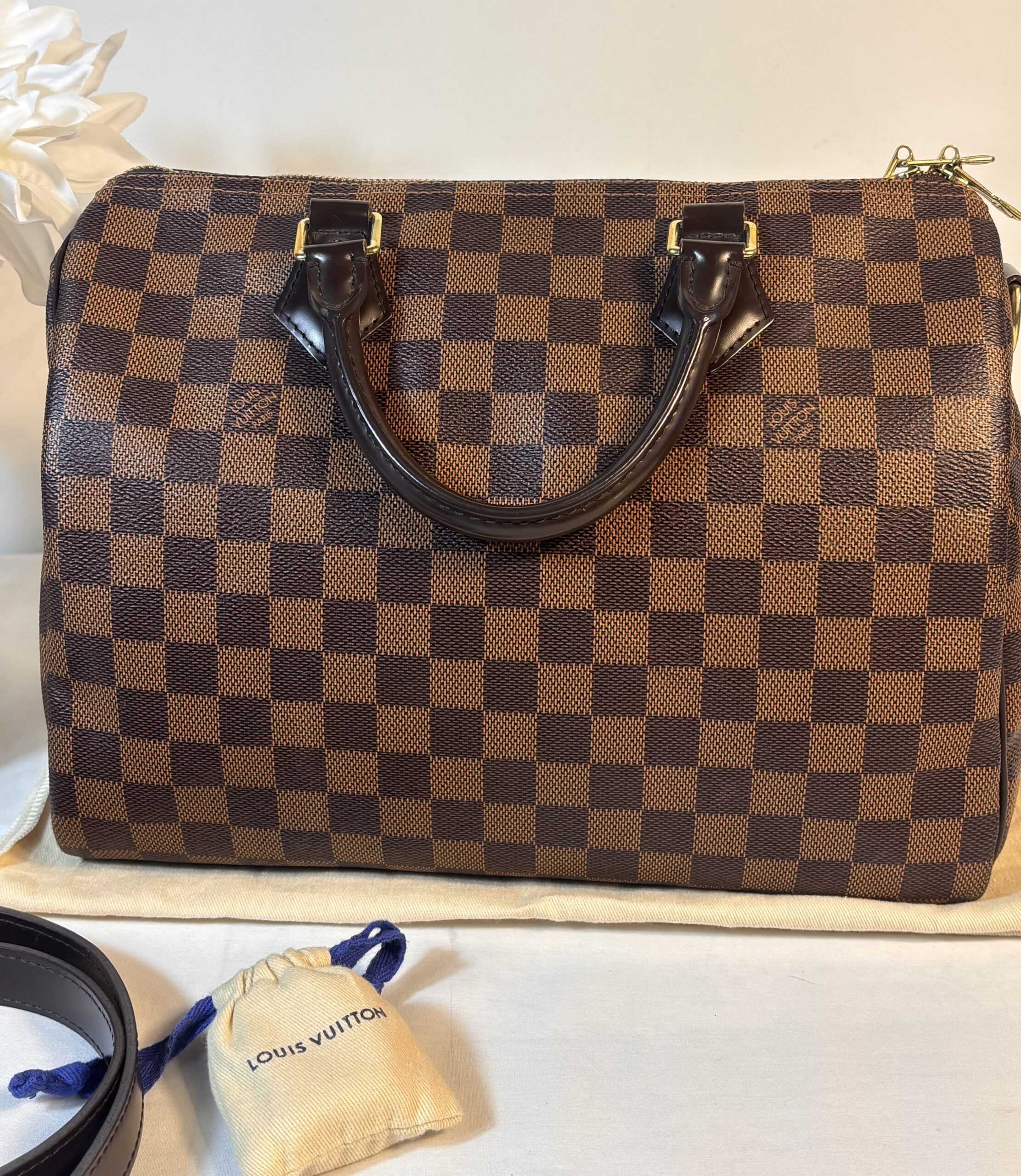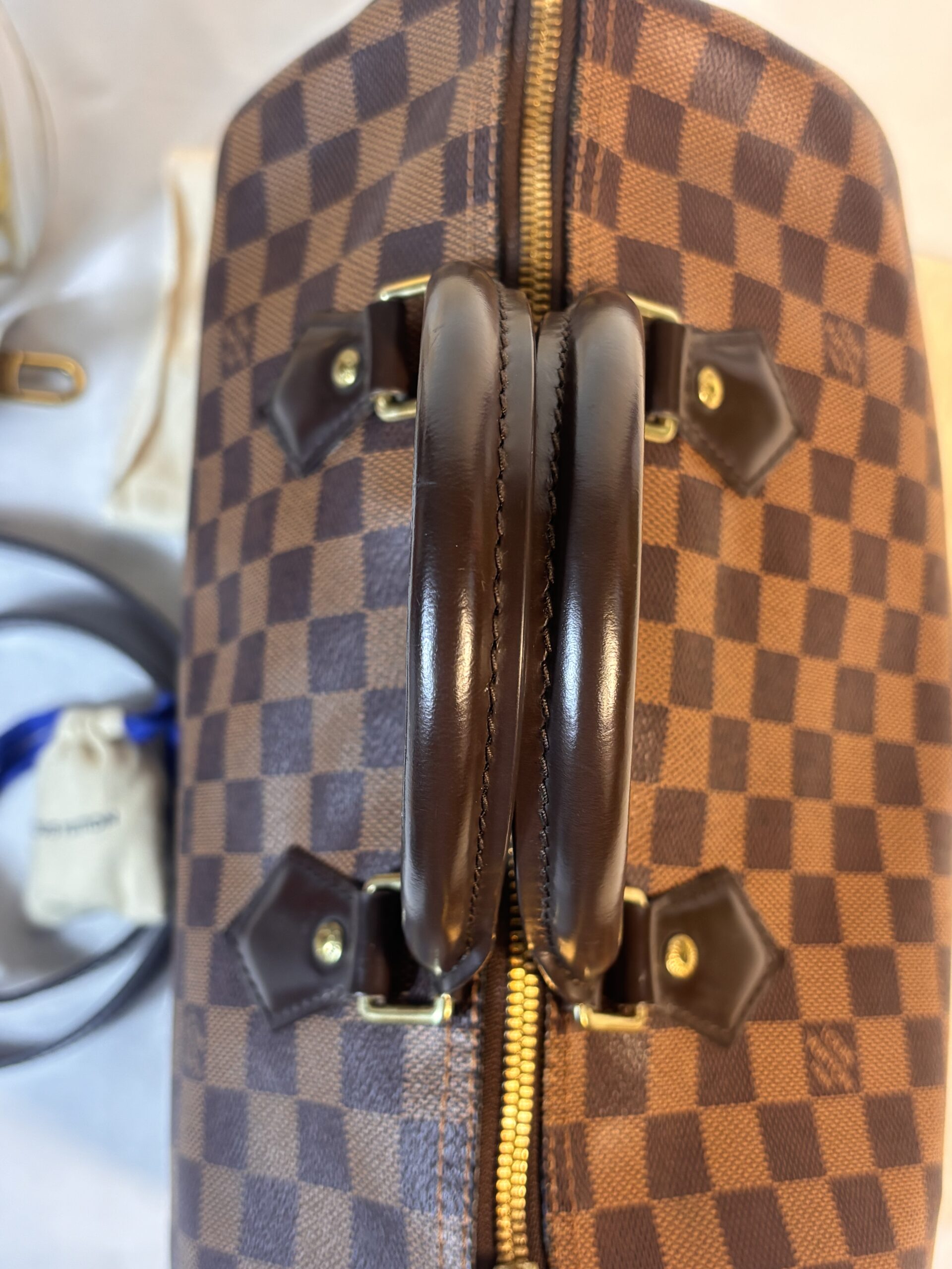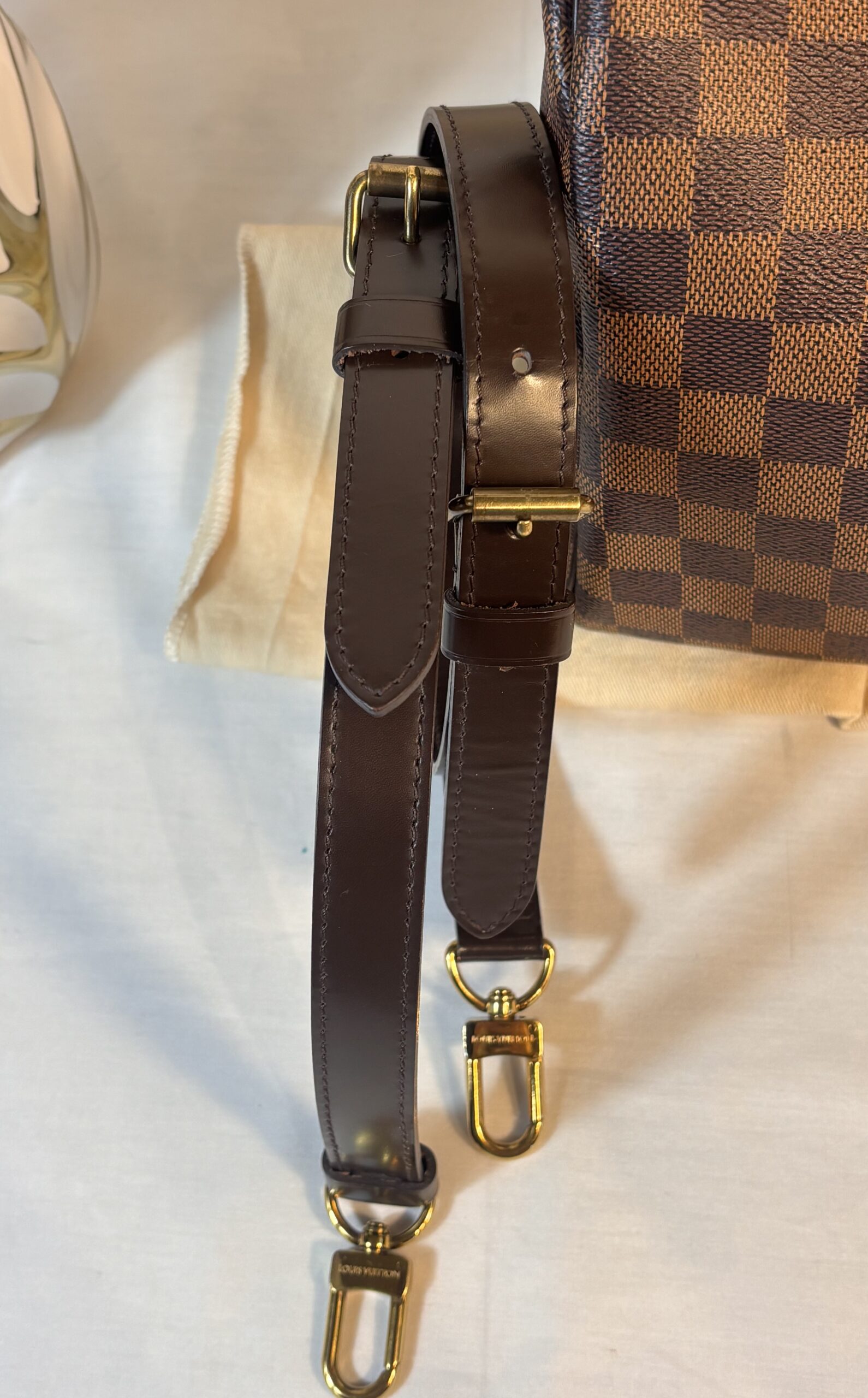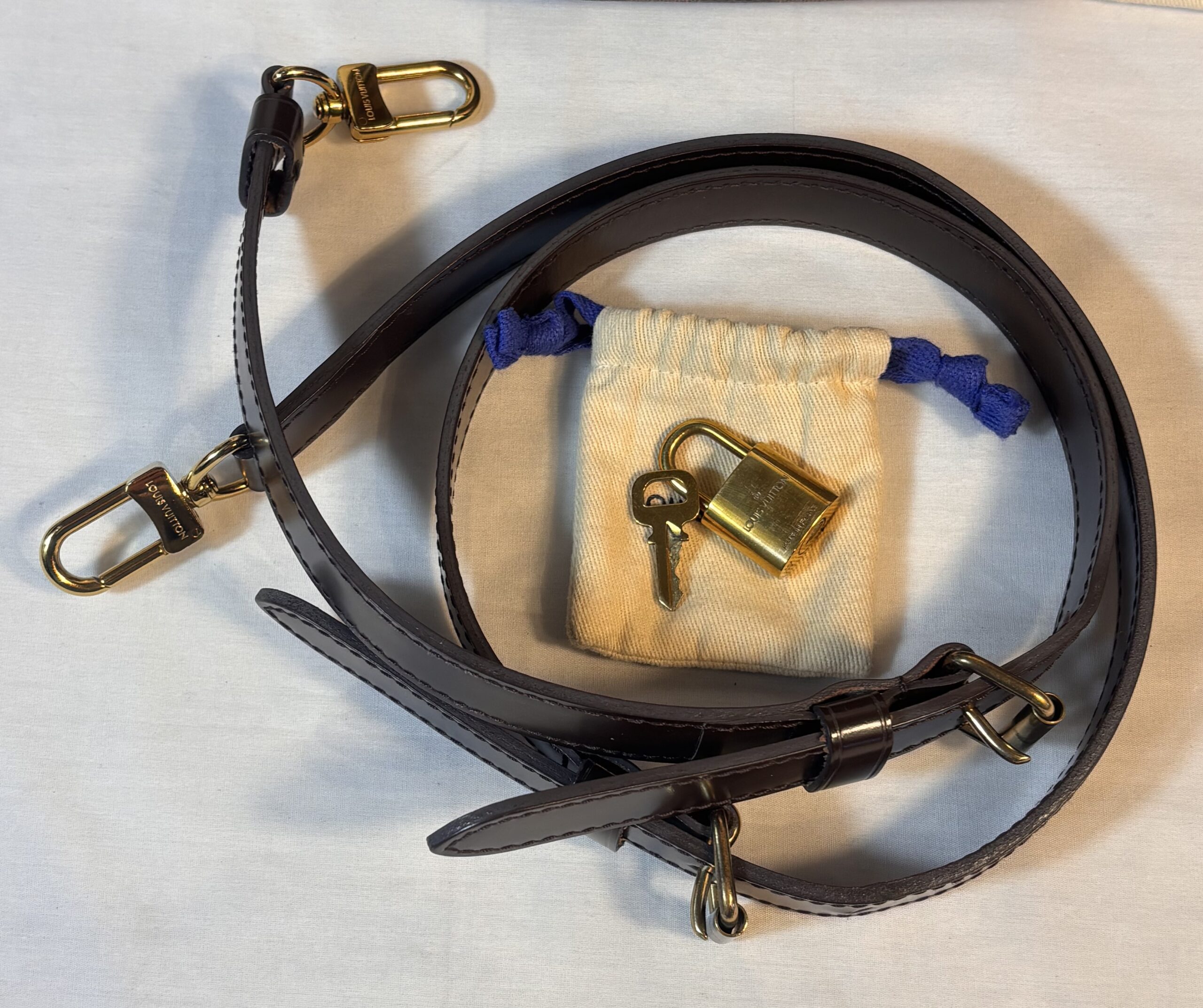Includes dust bag, strap, lock and key