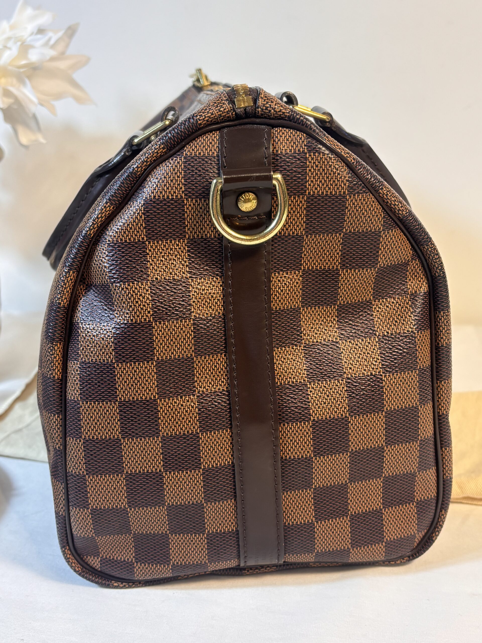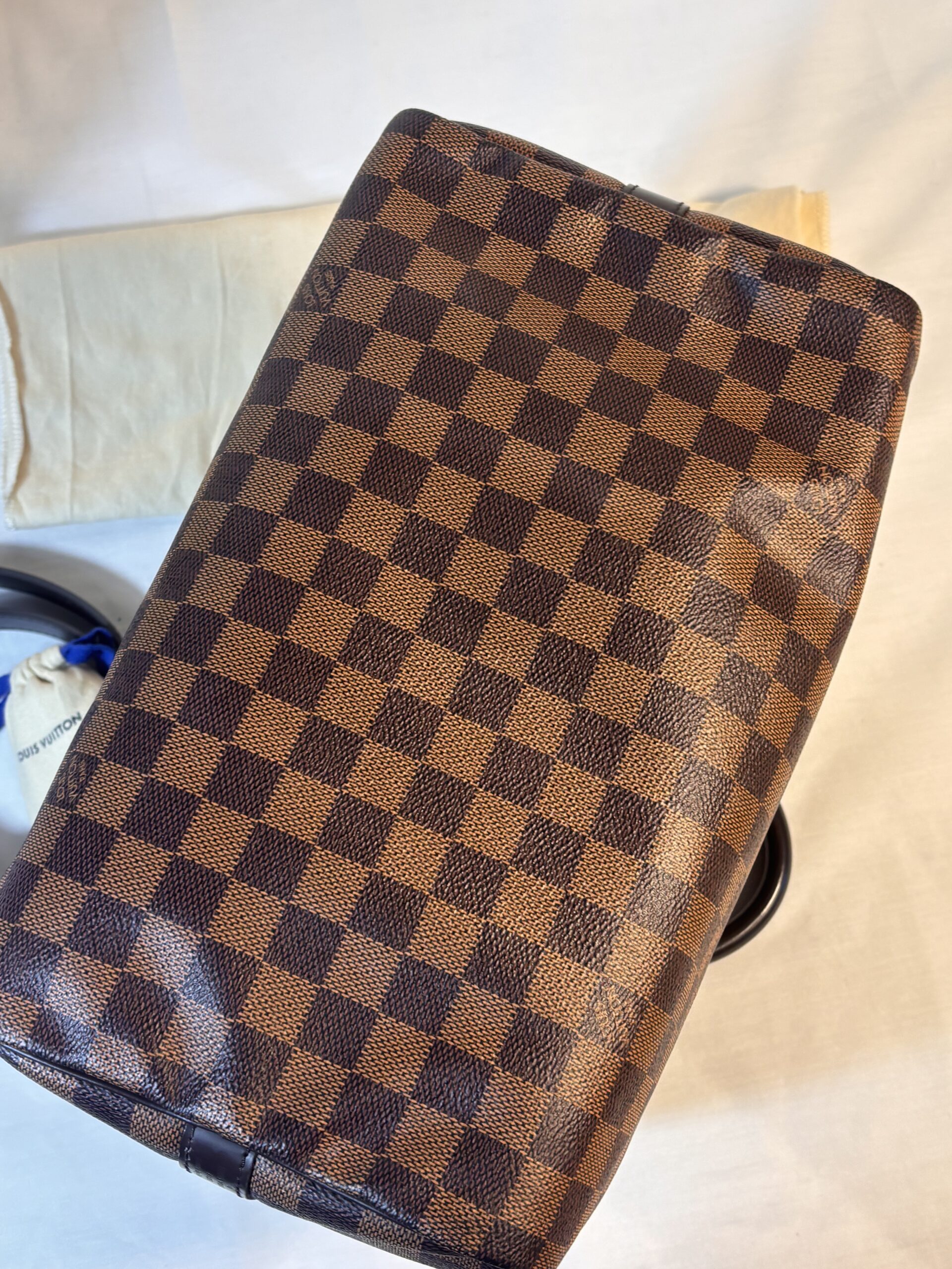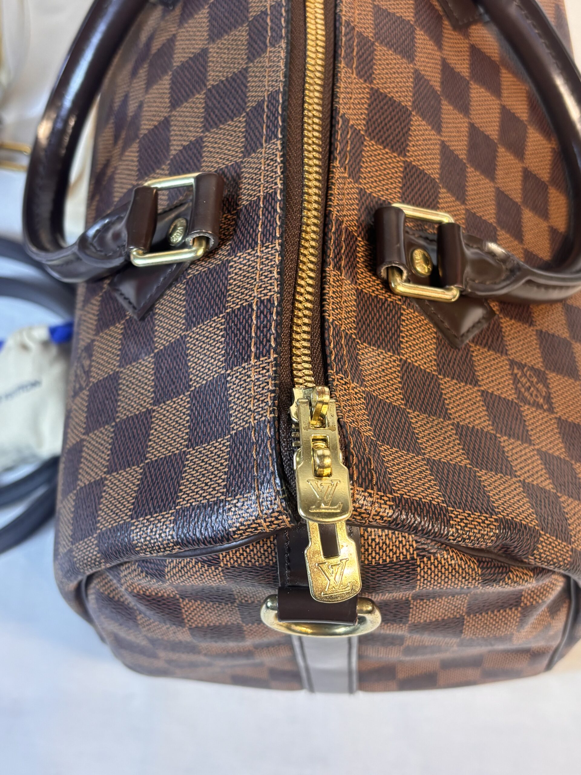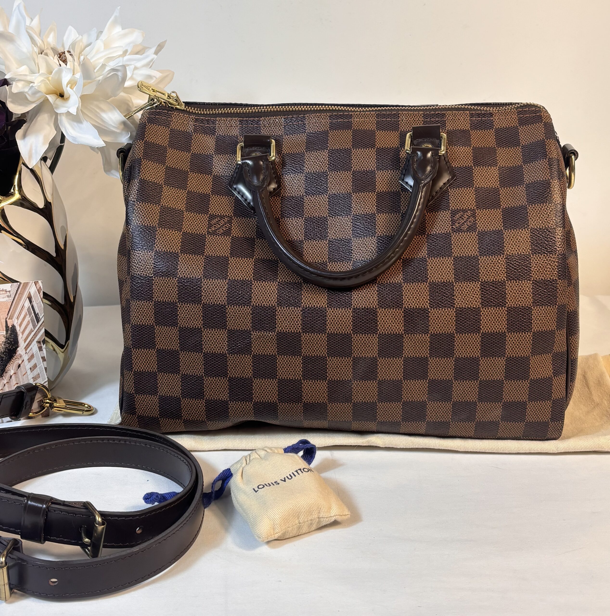 Includes dust bag, strap, lock and key